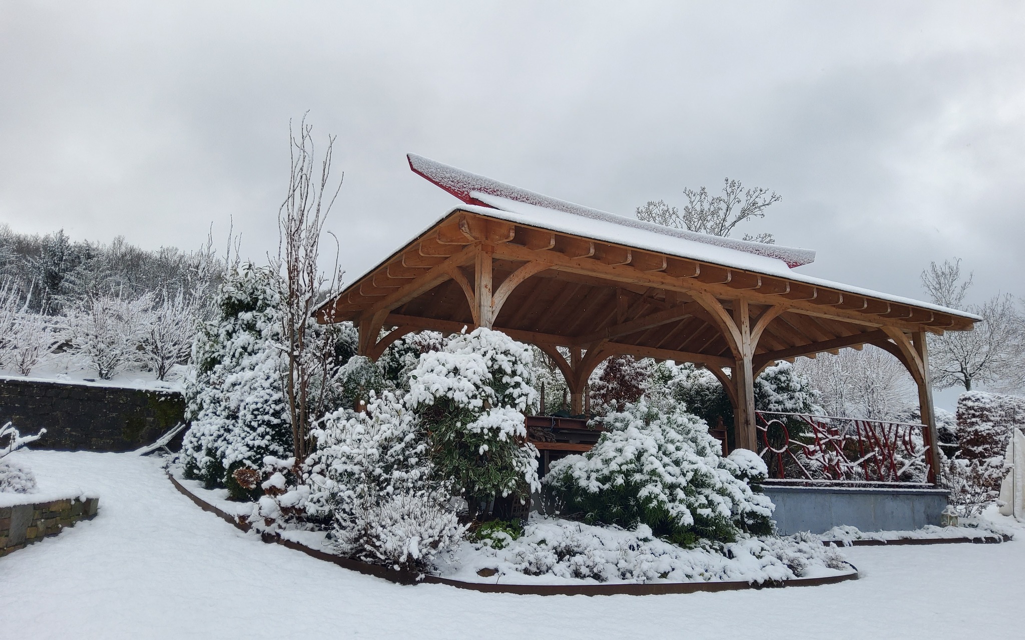 Un jardin paysagé agrémenté d'éléments architecturaux et décoratifs.
